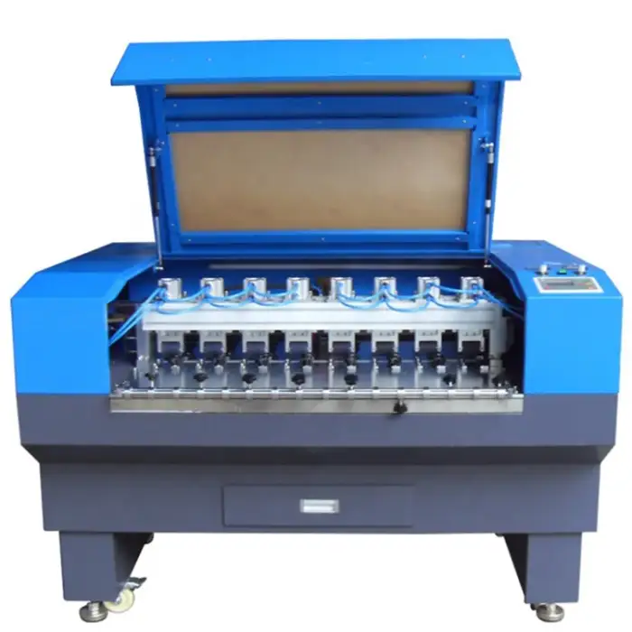 This machine can cut a variety of materials including Acrylic, Glass, Leather, MDF, Paper, Plastic, Plexiglass, Plywood, Rubber, Wood, and Crystal.