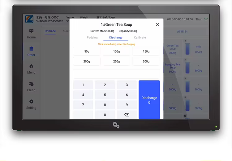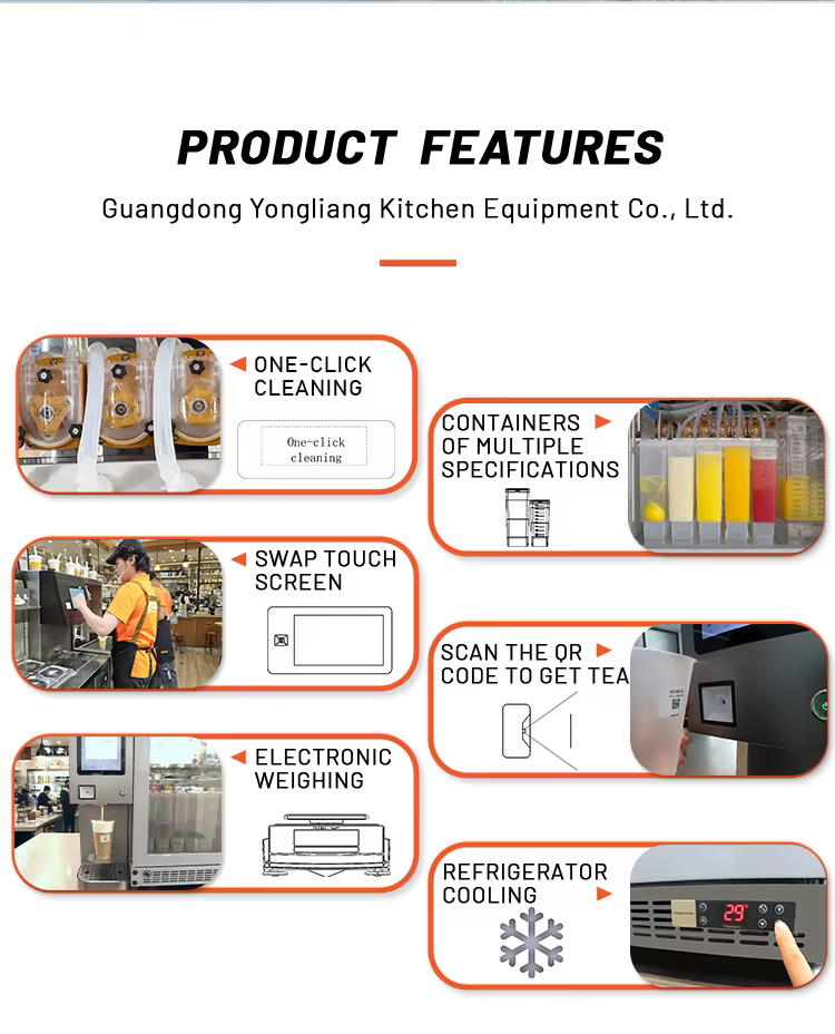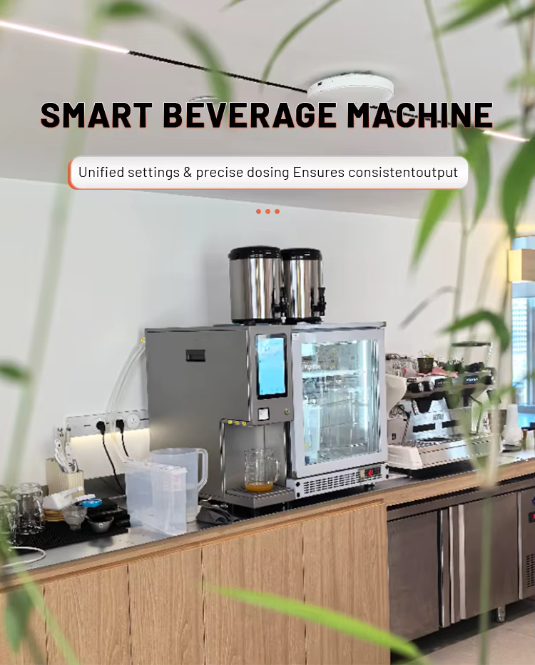 The machine dispenses tea at a speed of 55ml/s, milk at 50ml/s, syrup at 40ml/s, and jam at 25ml/s, allowing for quick service.
