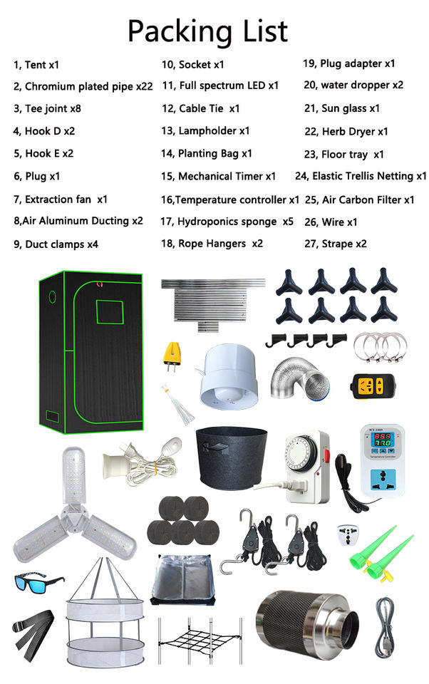The kit includes a 45W LED grow light, a 4-inch fan, a carbon filter, a hydroponic indoor bag, and a floor tray.