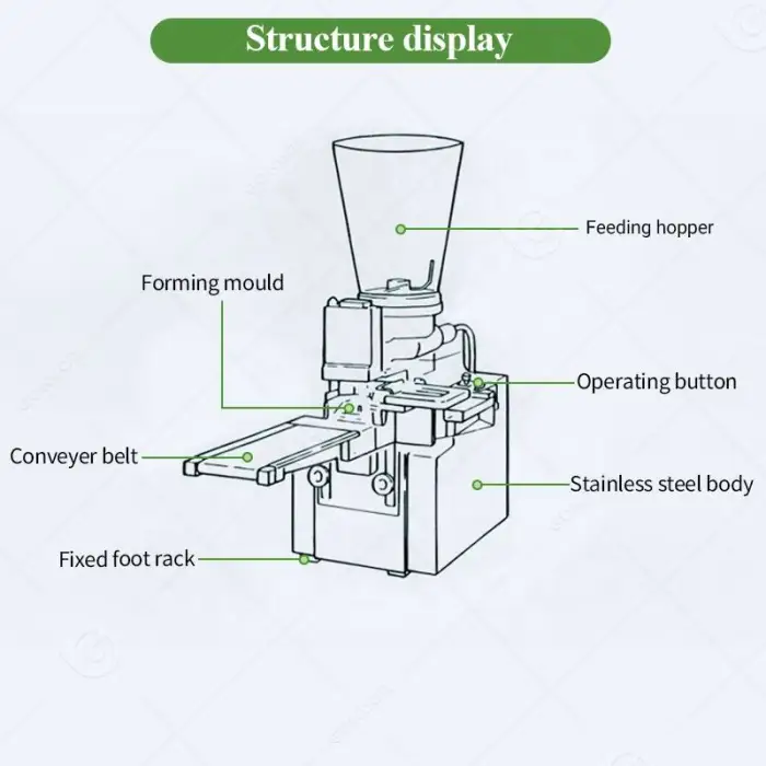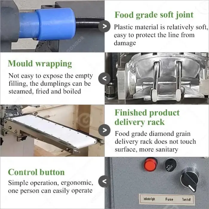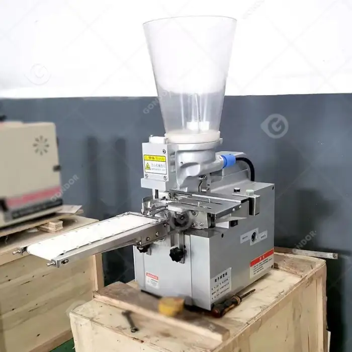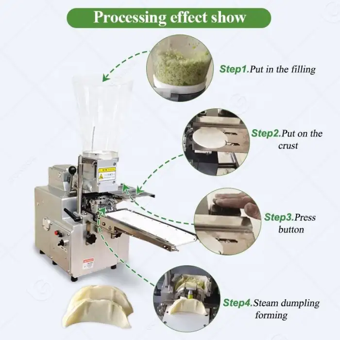 The Handmade Aut Grain Tabletop Commercial Product Gyoza Small Dumpling Make Machine has a production capacity of up to 1500 pieces per hour.