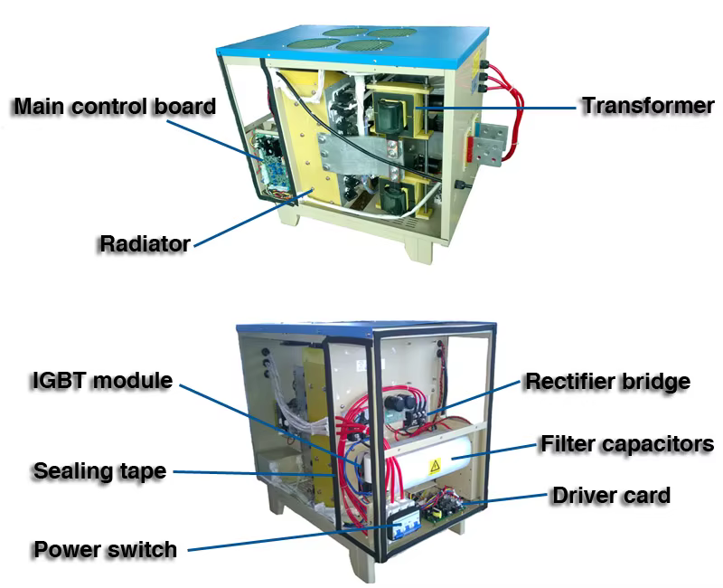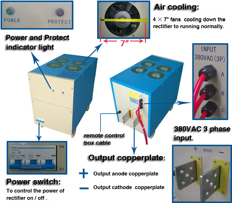 This rectifier uses an air-cooled design for efficient heat management, which helps maintain optimal performance during operation.