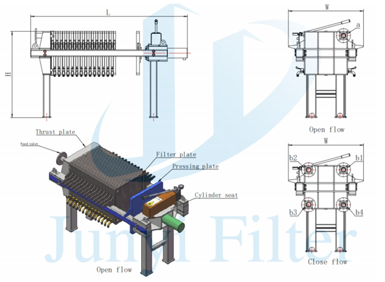 The filter press features a robust construction made of stainless steel, ensuring durability and reliability.