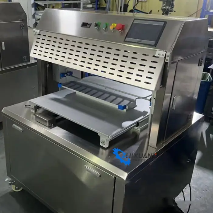 The machine utilizes advanced ultrasonic technology for clean and precise slicing.