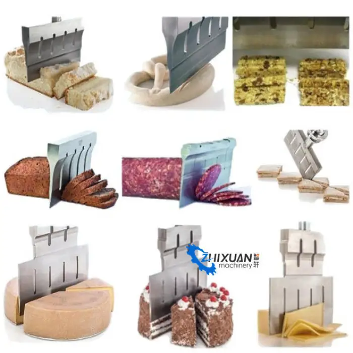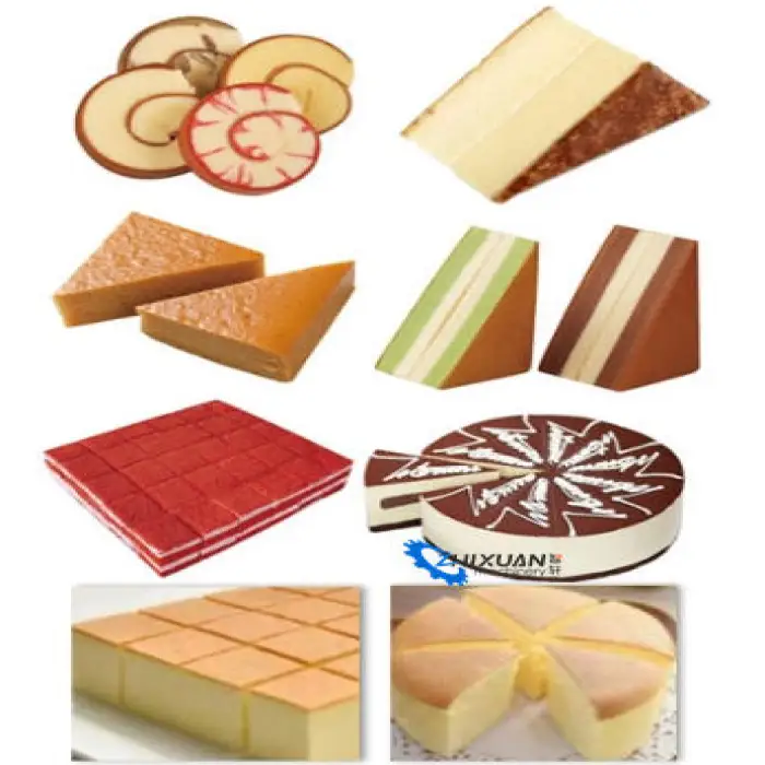 The High Speed Full Automatic Round Square Cake Mozzarella Cheese Food Bread Cutting Slicing Machine can cut various types of food including cakes, mozzarella cheese, bread, and snacks.