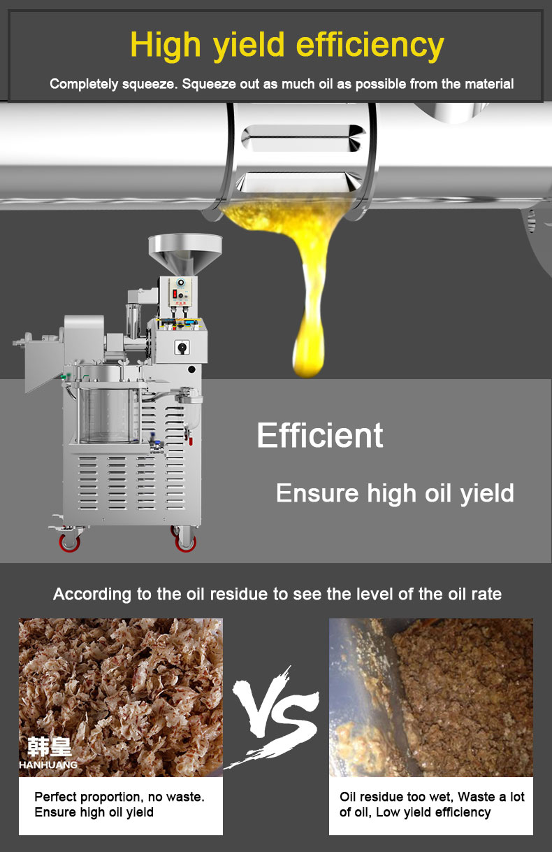 Yield depends on the oil content of the raw material, moisture level, pre-treatment and pressing mode. Cold pressing typically yields slightly less than hot pressing. For estimated yields for a specific seed (e.g., peanut, soybean), consult seed-specific data or request test reports from the manufacturer.