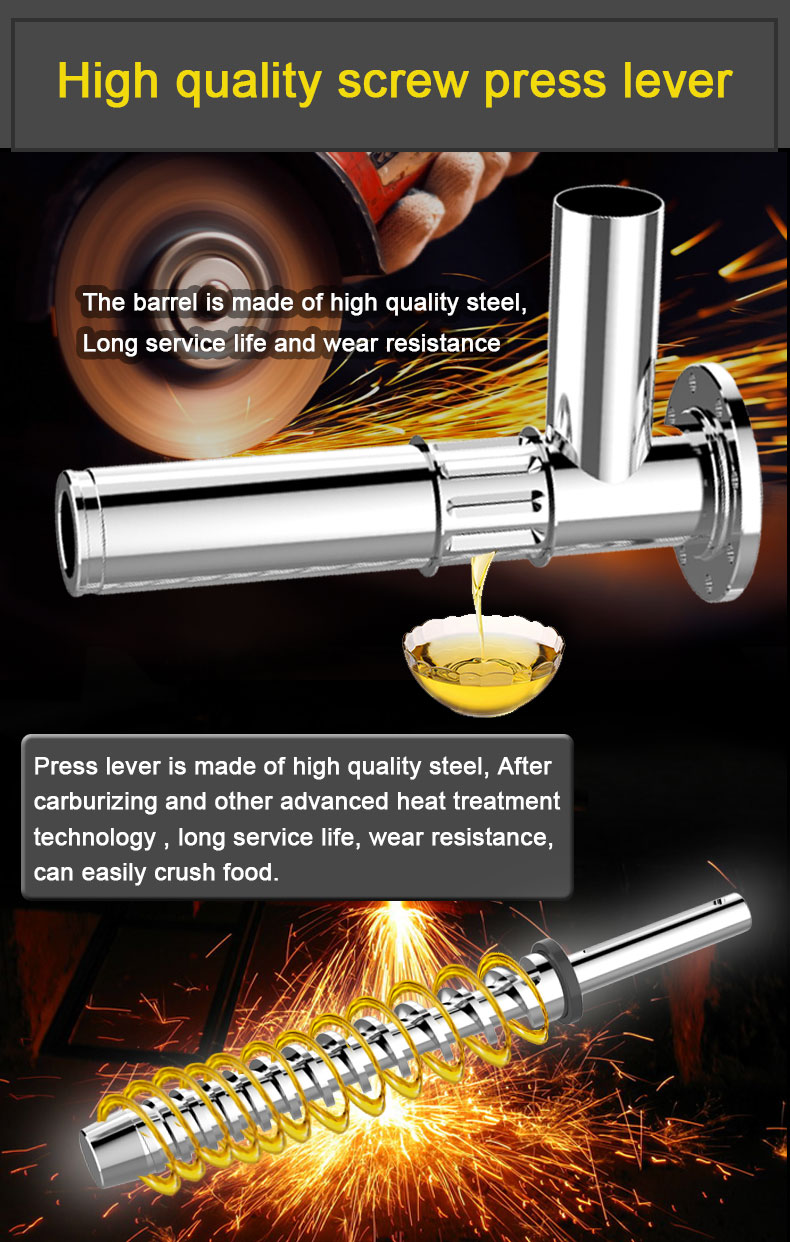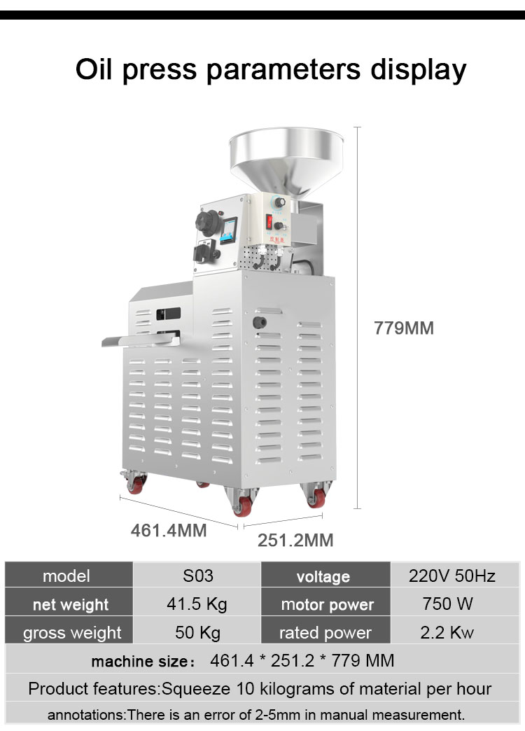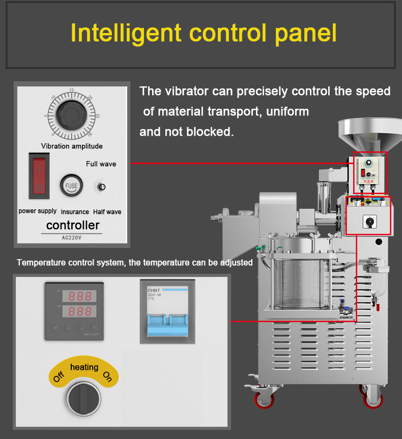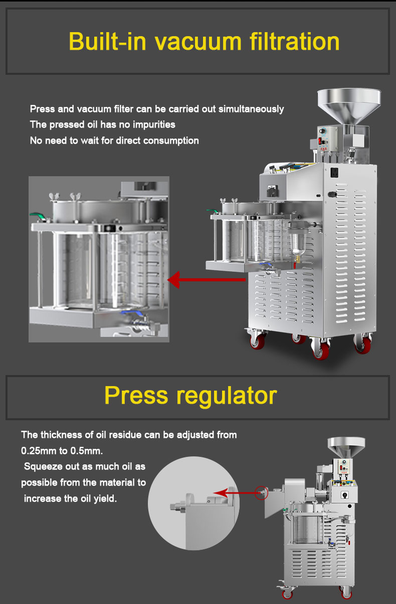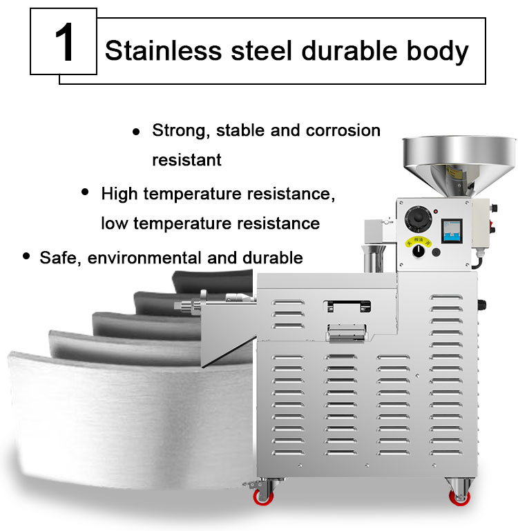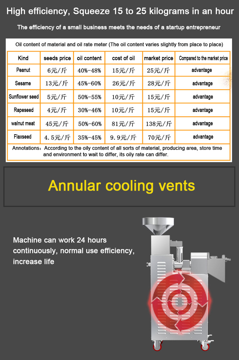 It can process a wide range of oil-bearing seeds and nuts, including flax seed, soybean, rapeseed, tea seed, basil, sesame, pine nut, sunflower, almond, walnut, peanut, coconut, olive, and palm.