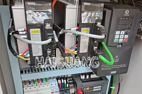 The machine is equipped with standard safety features such as emergency stop buttons and safety guards to protect the operator.