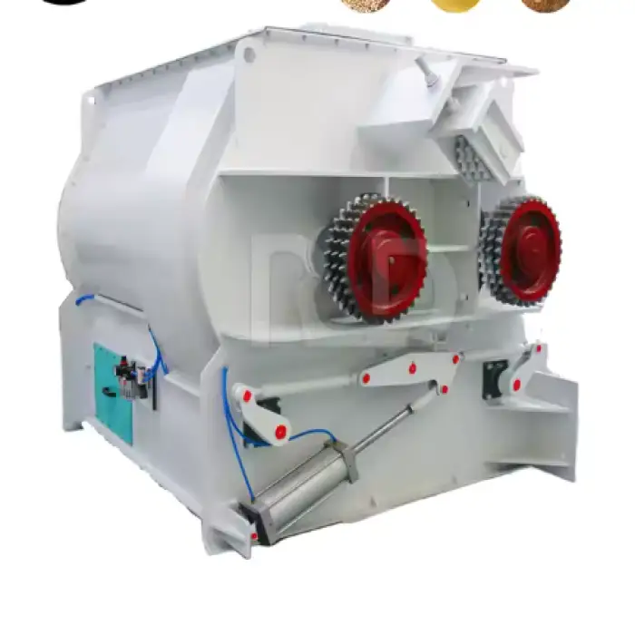 The mixer uses a paddle shaft for mixing, ensuring uniform feed consistency.