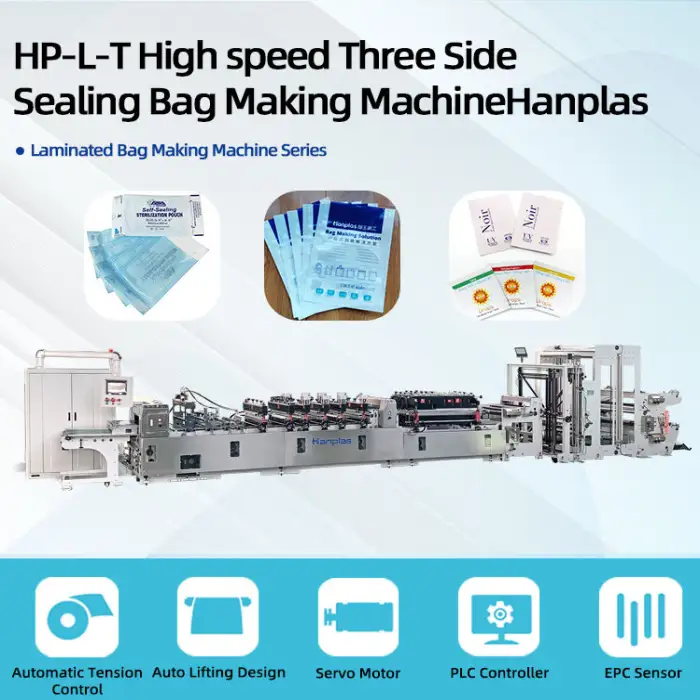 The HP-L-T machine produces three side sealing sterilization pouches.