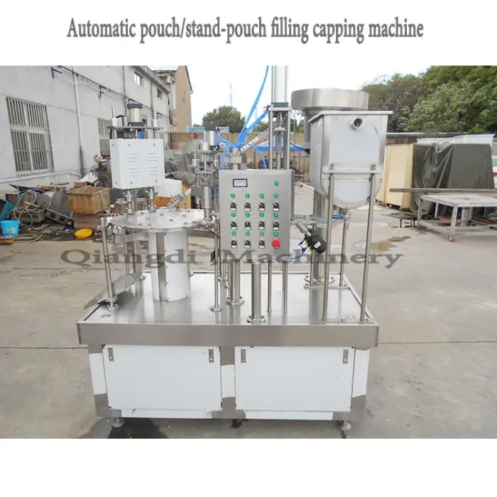 The machine is designed to work with stand pouches and is suitable for various pouch types and materials.
