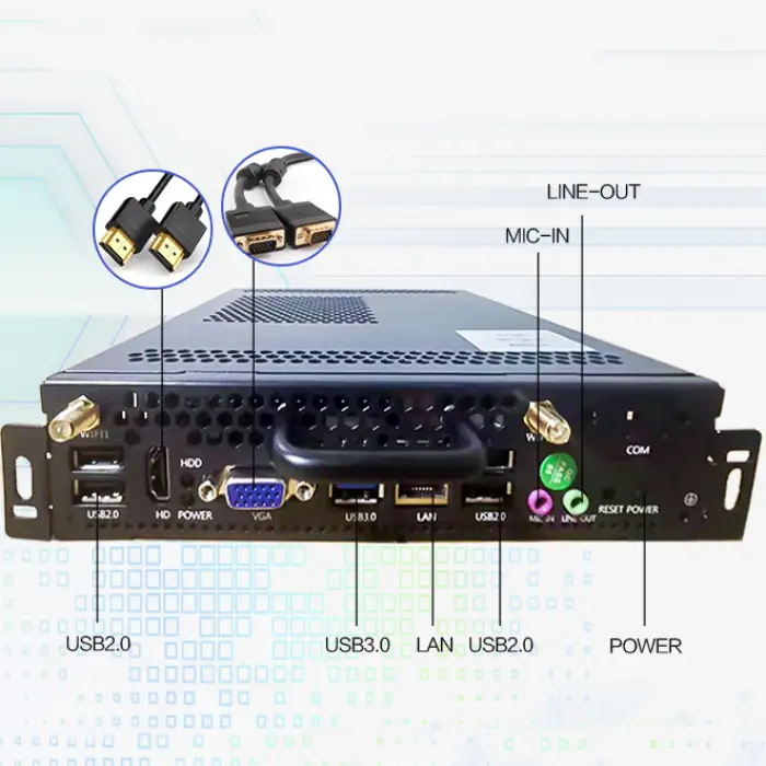 The Industrial Computer 4K Display OPS Mini PC offers CPU options including Core I3, I5, and I7.