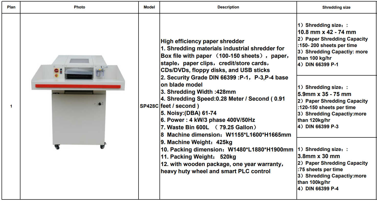 The shredder provides security grade P-1, P-3, and P-4 shredding options.
