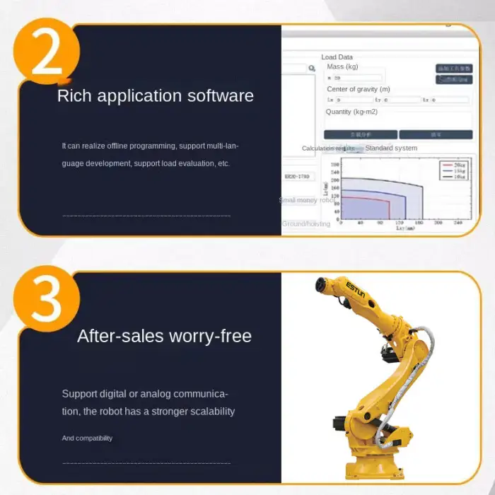 The Industrial Robotic Arms are designed for a variety of tasks including welding, stamping, handling, loading, unloading, and injection molding.