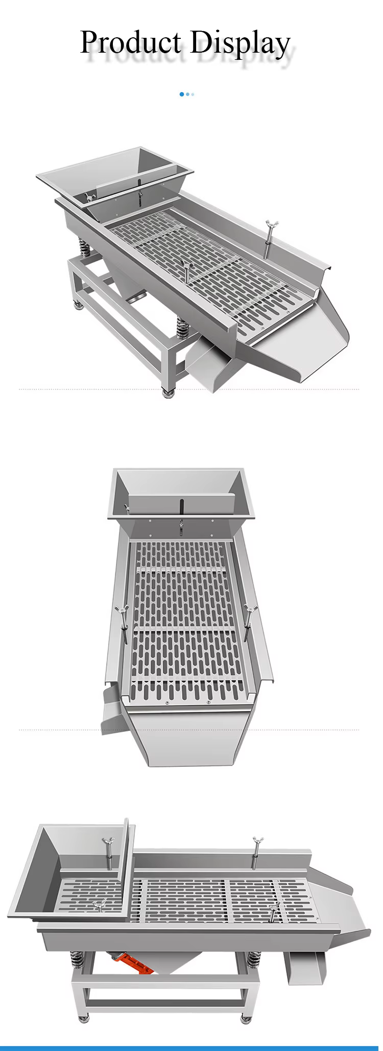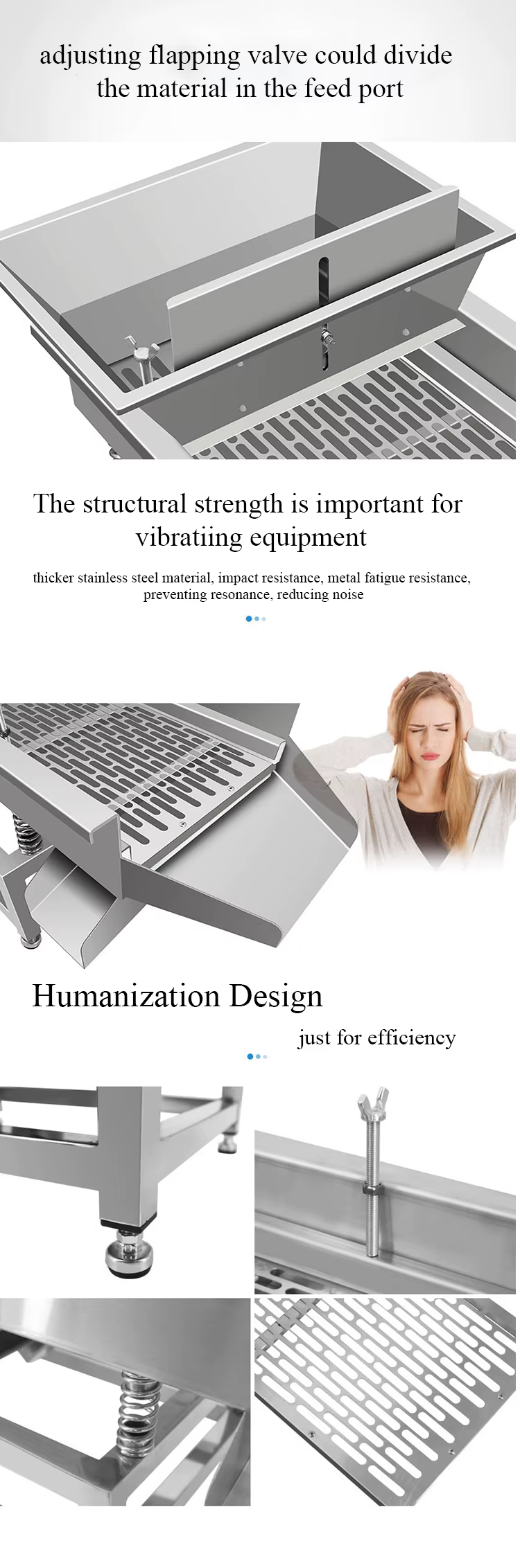 Key features include high efficiency with a double motor design, durable stainless steel construction, easy operation and maintenance, and versatility for various granular materials.