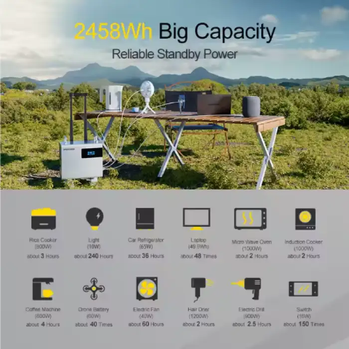 The Large Capacity Portable AC Power Station has a capacity of 3600Wh, with options for 2458Wh, 2240Wh, and 1228Wh.