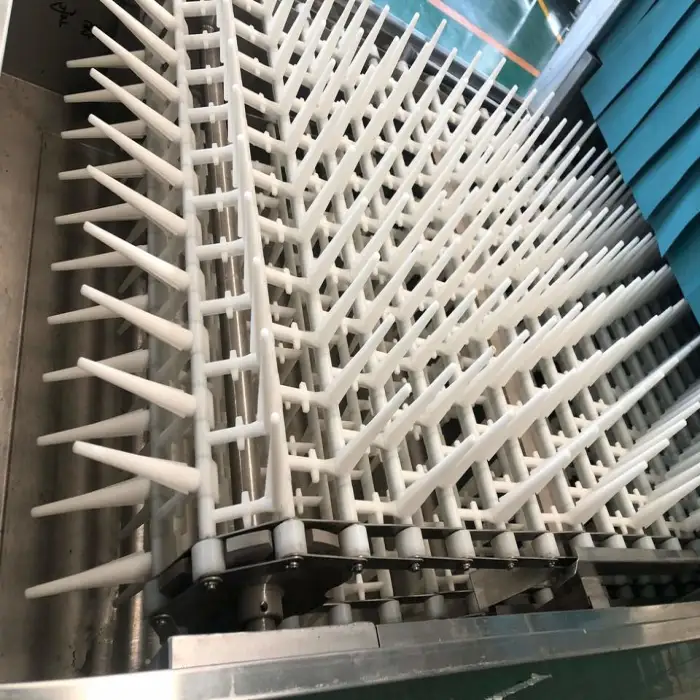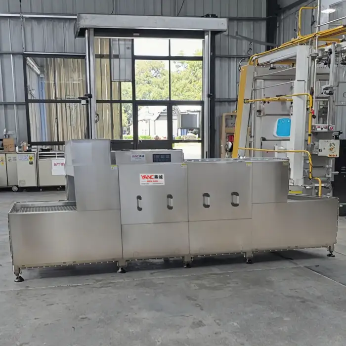 The machine thoroughly washes and rinses plastic boxes, ensuring high hygiene standards for food safety.