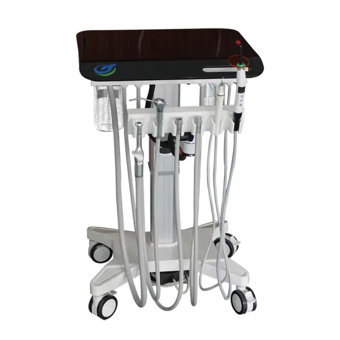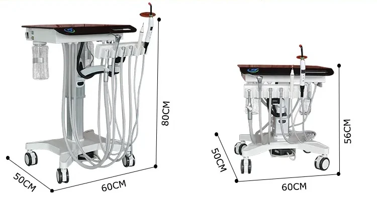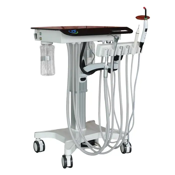 The unit includes a 3-way syringe, high volume ejector, two handpiece tubes, an LED curing light, ultrasonic scaler, self-contained water bottle, drainage bottle, electric height adjustment system, rotatable operating hanger, and a foot control system.