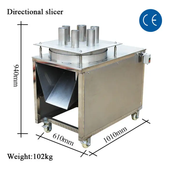 Key features include high efficiency for quick slicing and peeling, easy operation, durable stainless steel construction, and a compact design that fits well in any processing line.