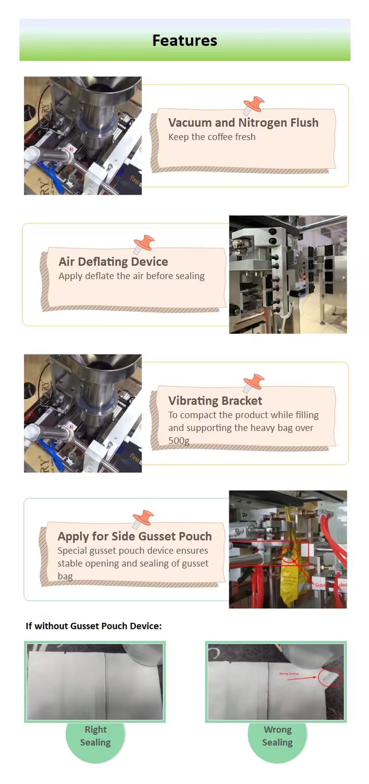 Core features include automatic operation, compatibility with various pouch types, high-quality components, and CE certification.