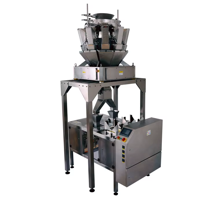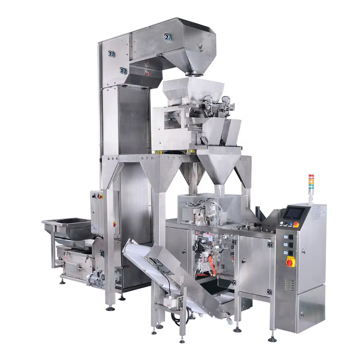 Key components include a motor, PLC (Programmable Logic Controller), and a multihead linear weigher.