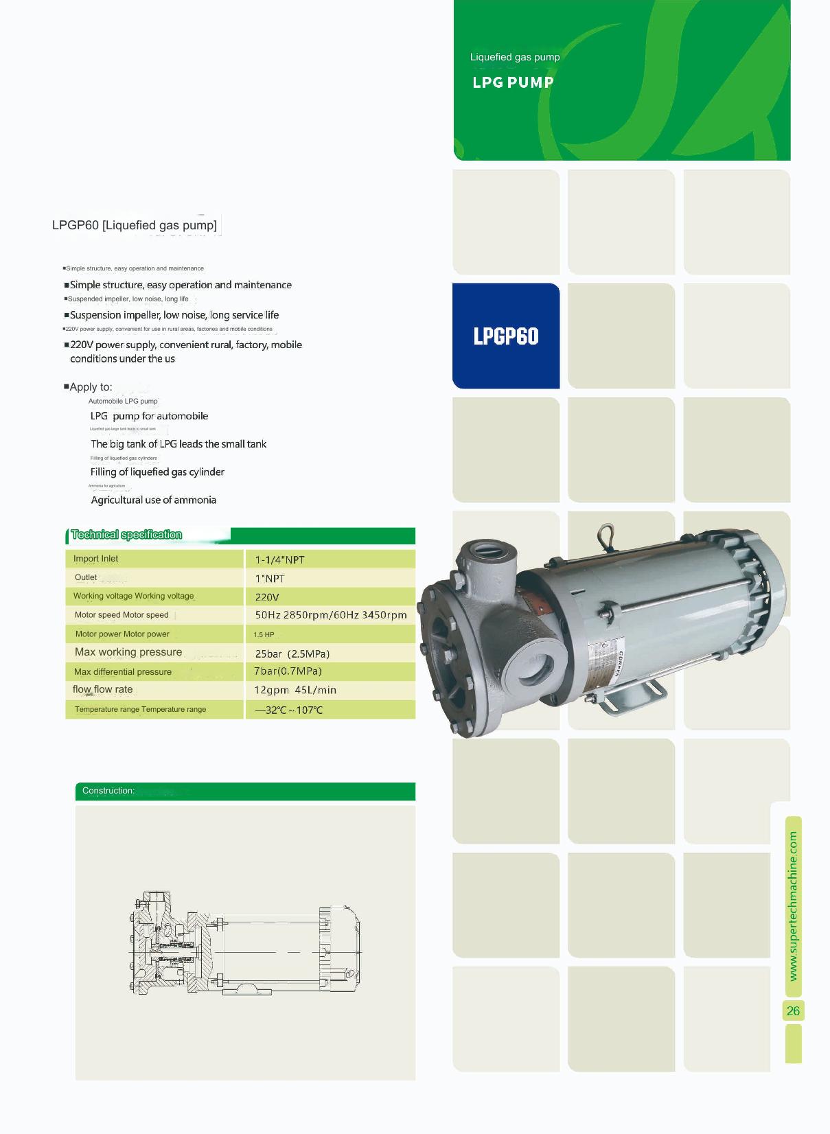 The LPG60 liquefied gas pump is designed for transferring liquefied petroleum gas (LPG) safely and efficiently in various applications, such as fueling stations and industrial settings.