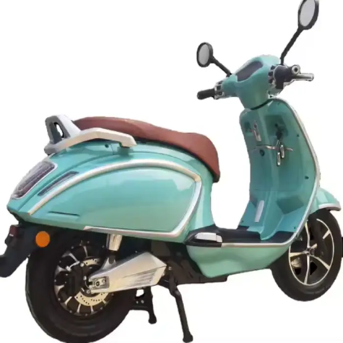 The scooter is available in a stylish light blue color.