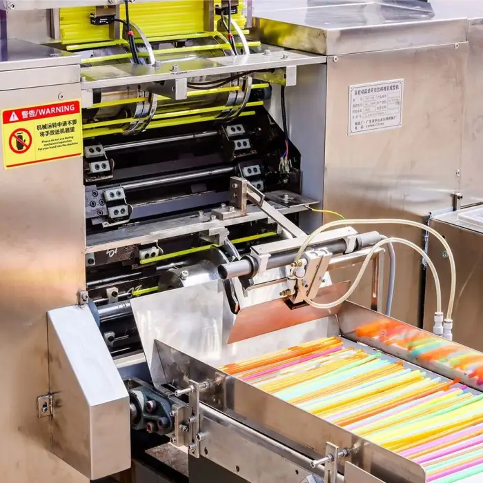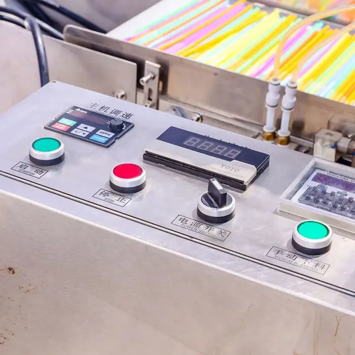 The machine is made from durable stainless steel and includes features for high-speed production, ensuring consistent quality in each straw produced.