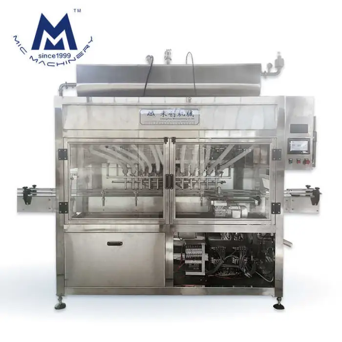The machine utilizes a piston pump with servo motor control for accurate filling.