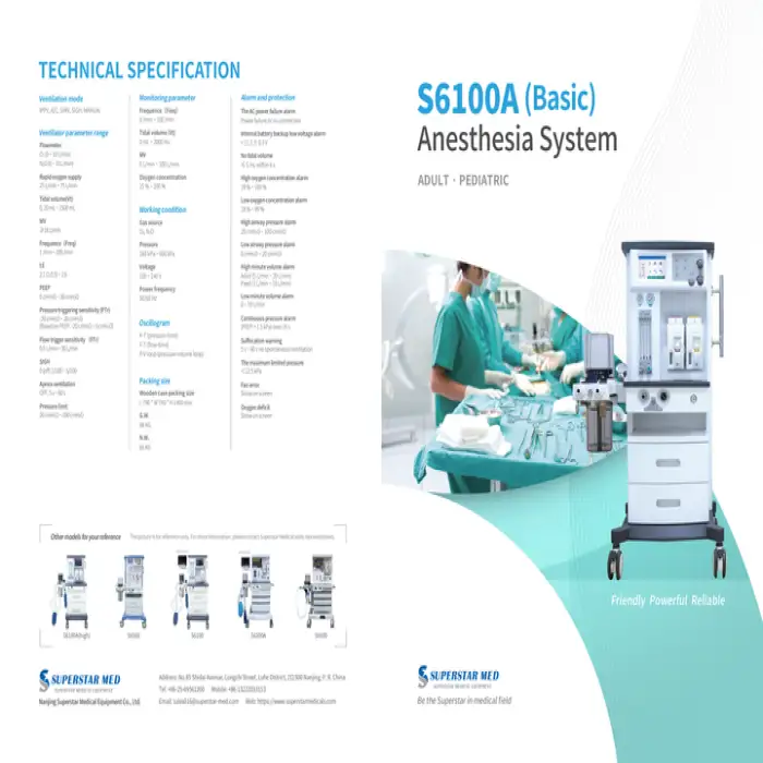 The S6100A Basic Anesthesia System Machine is designed for use in anesthesiology operating rooms, facilitating safe and effective anesthesia delivery during surgical procedures.