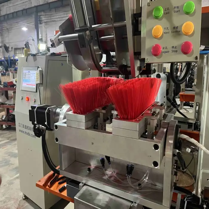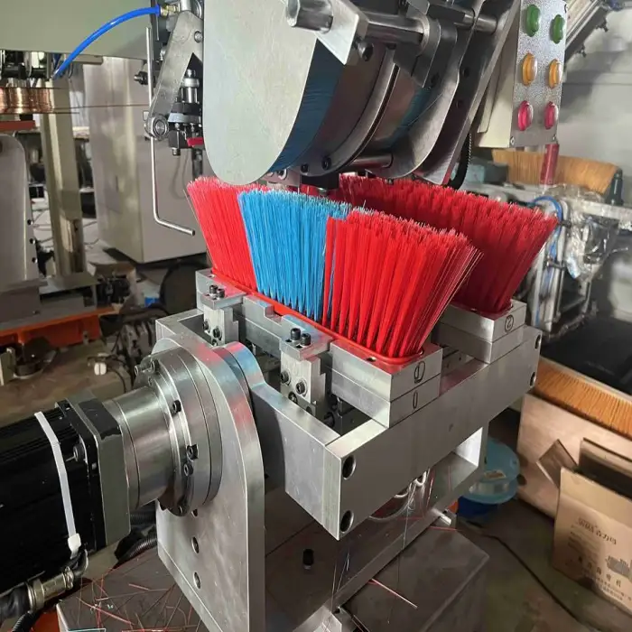 The machine is designed to work with plastic materials for creating cleaning brushes.