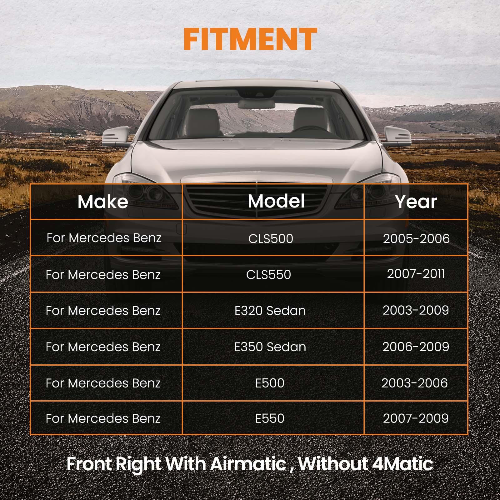 This air shock pair is compatible with the Mercedes-Benz CLS (C219) from 2004 to 2011 and the E-Class (W211) from 2002 to 2009.