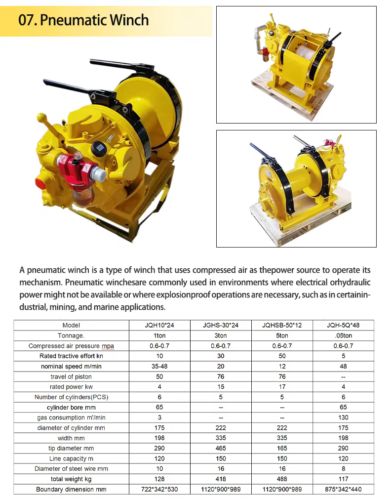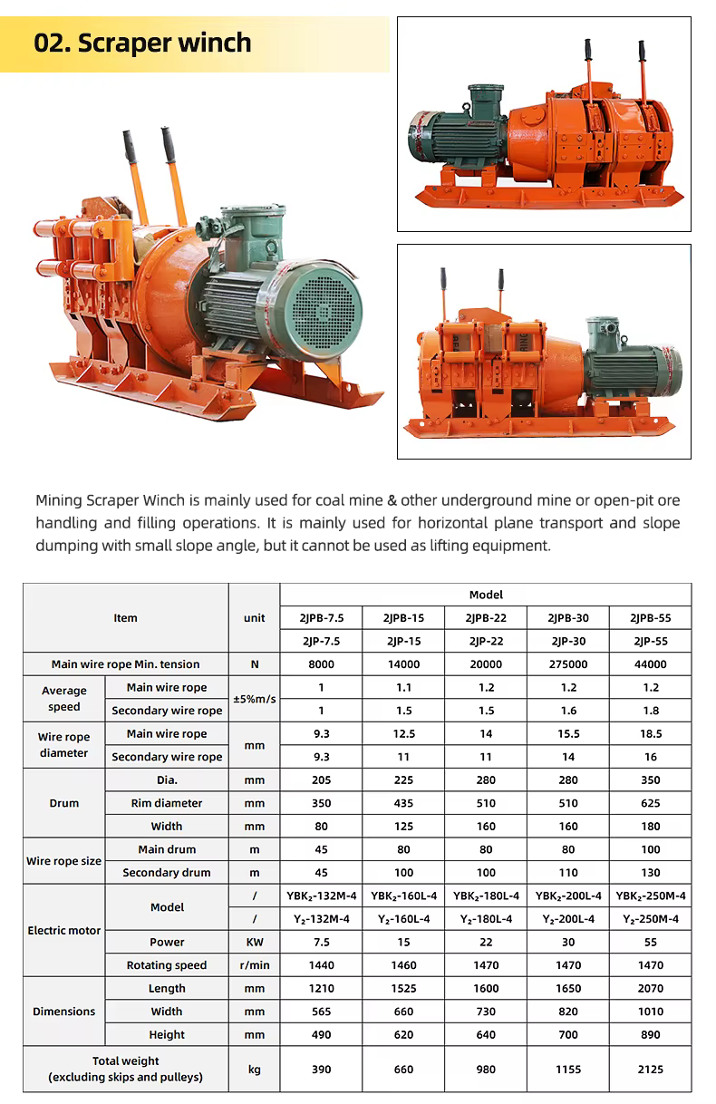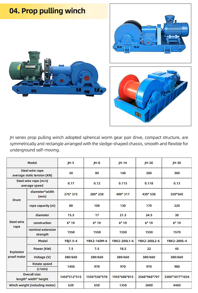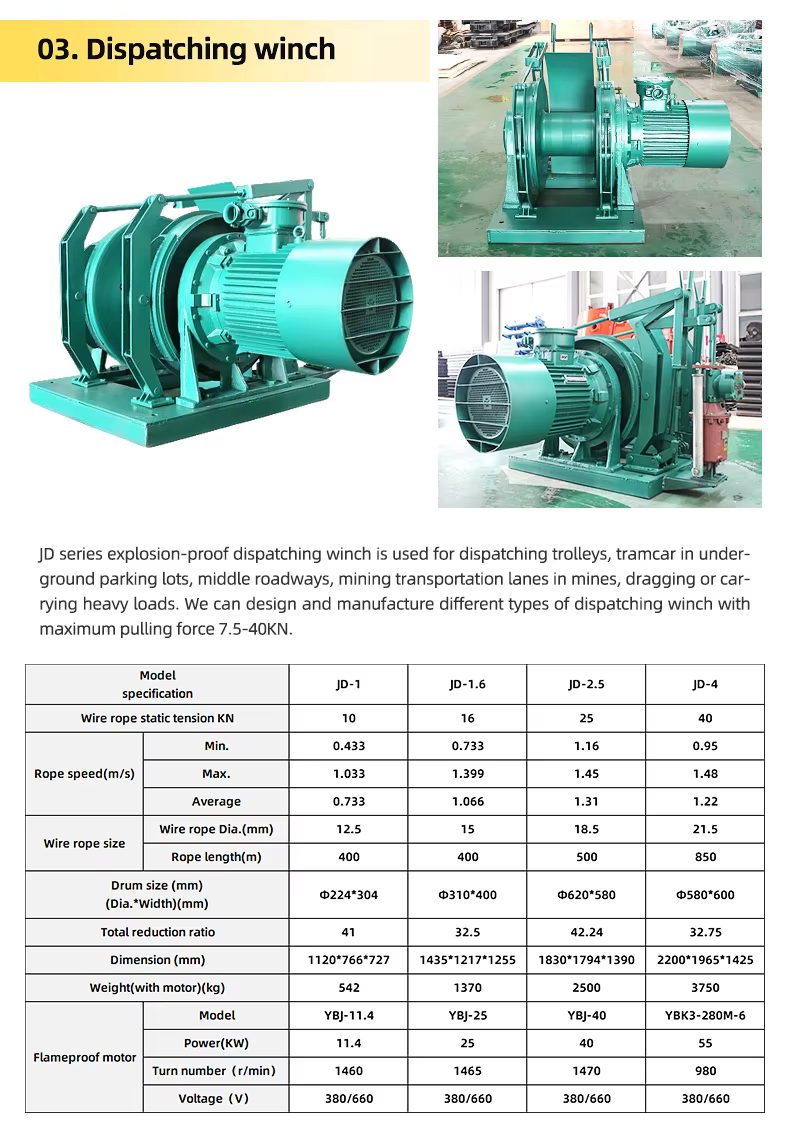 The winch features an optional explosion-proof motor and a robust construction to ensure safety during operation in underground environments.