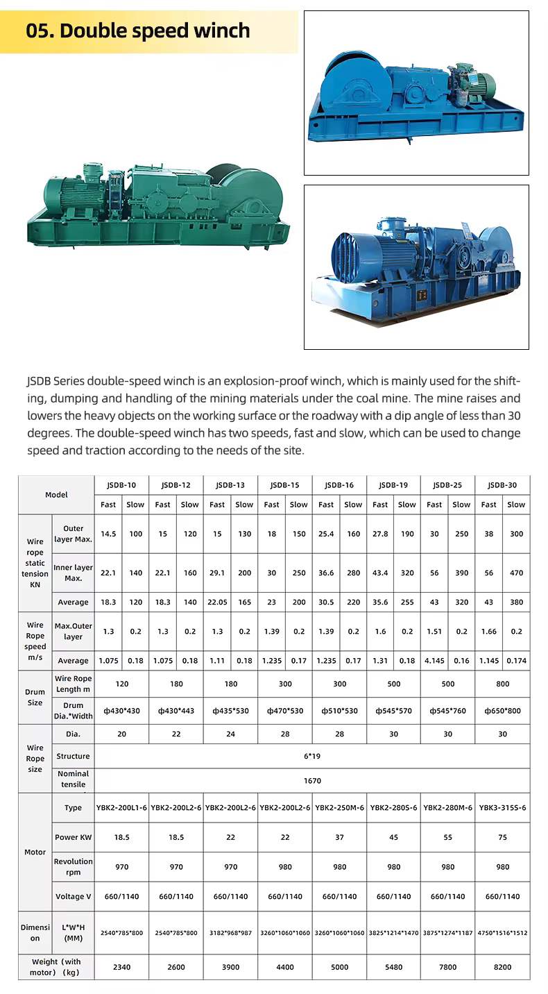 The Mining Machinery Underground Lifting Equipment Double-speed Multi-purpose Winch has an average static tension capacity of up to 300 KN, making it capable of handling heavy loads.