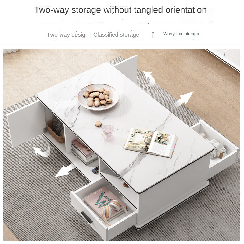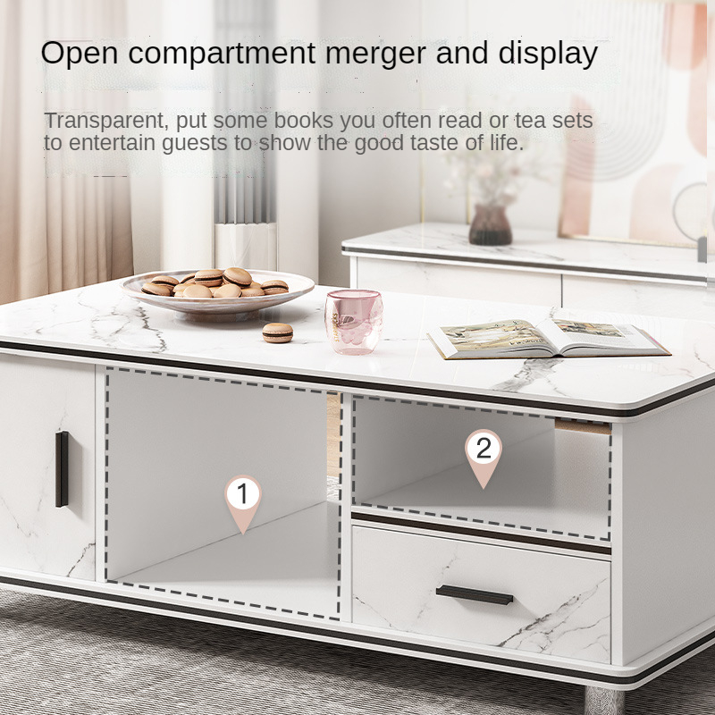The coffee table features a manual adjustable-height mechanism that lets you raise or lower the tabletop and lock it into position for use as a low coffee table or a higher surface for dining or working. Detailed operating and safety instructions are included with the product.