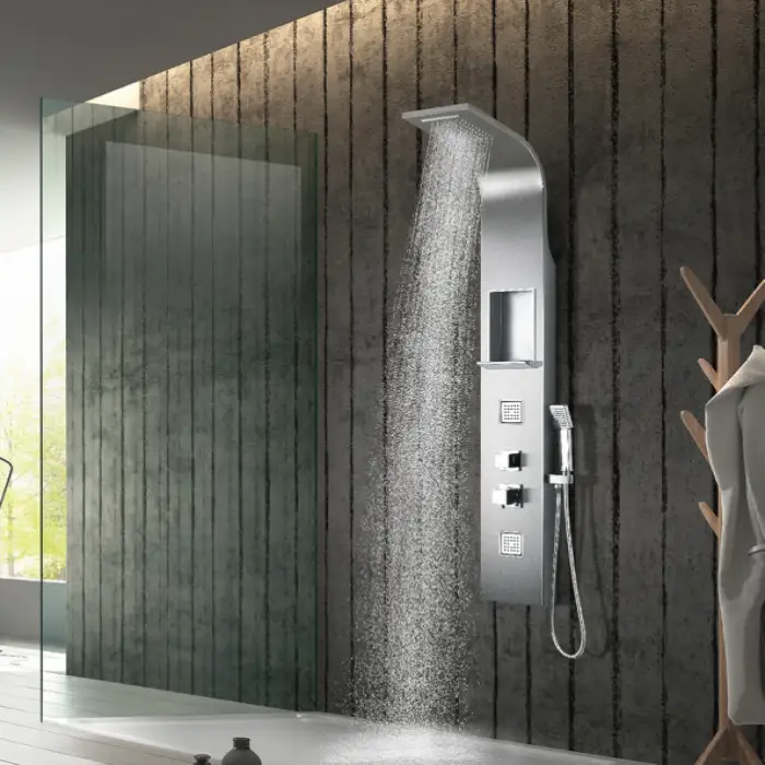 The Modern Stainless Steel Shower Column Waterfall Shower Panel is constructed from high-quality stainless steel, ensuring durability and resistance to corrosion.