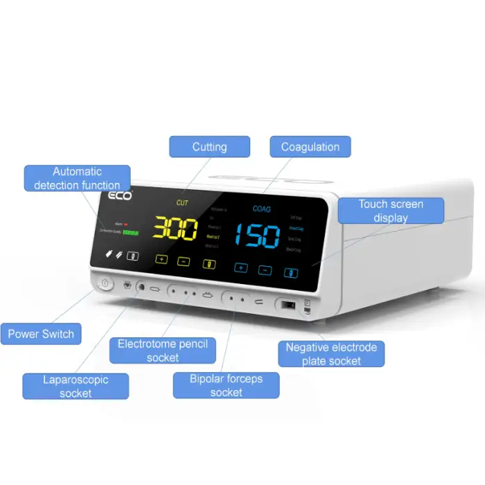 The unit features several coagulation modes including soft, forced, spray, and bipolar coagulation.