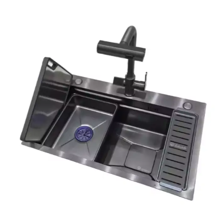 The sink features a modern waterfall design that enhances the aesthetic of your kitchen.