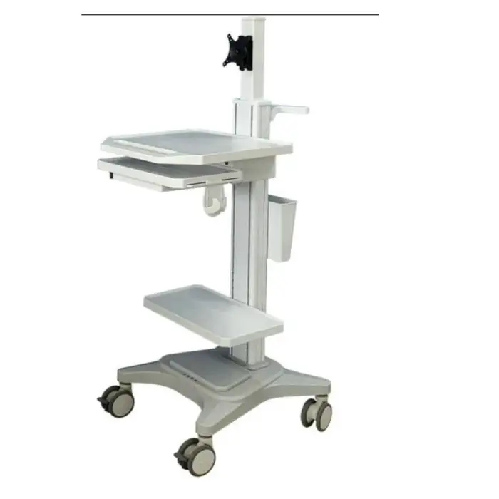 The trolley has four medical silent casters—two with brakes and two without—to allow smooth movement and stable locking when required.