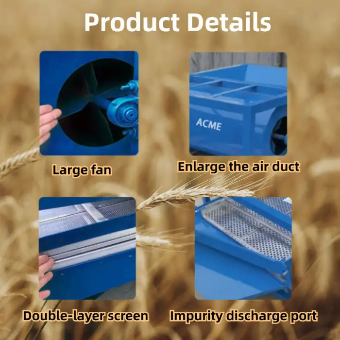 Key features include high productivity, durable construction, effective screening, and separation of various grains.
