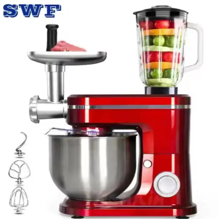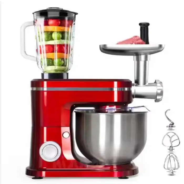 The stand mixer includes essential accessories like a dough hook and other attachments to assist with various tasks.