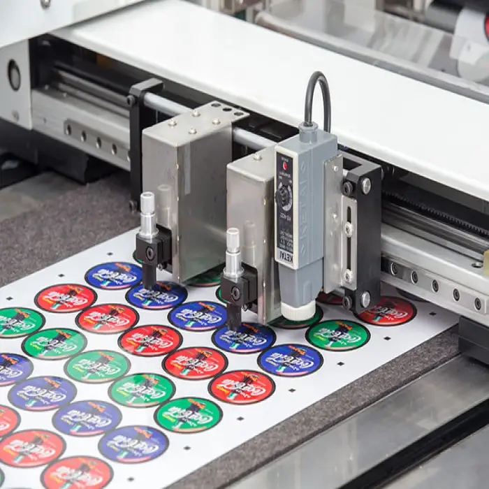The core components include a motor, PLC, and an embossed sticker die cutter.