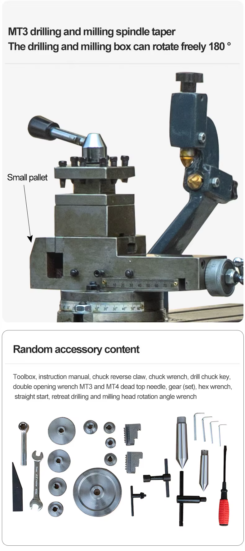 The MY7800 Combo Lathe Milling Machine is designed for metalworking, allowing users to perform lathe, milling, and drilling functions in one compact machine. It is ideal for creating precision parts, hobbyist projects, and small-scale manufacturing tasks.