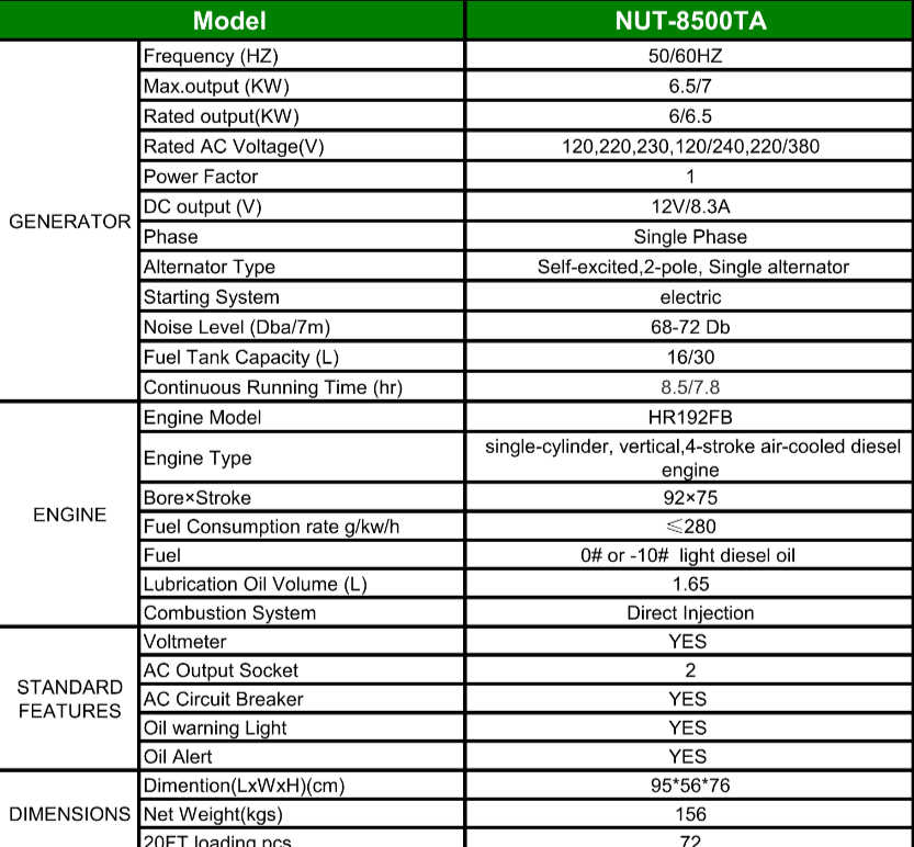 The maximum output of the NUT-8500TA generator is 6.5 KW for 50Hz and 7 KW for 60Hz.