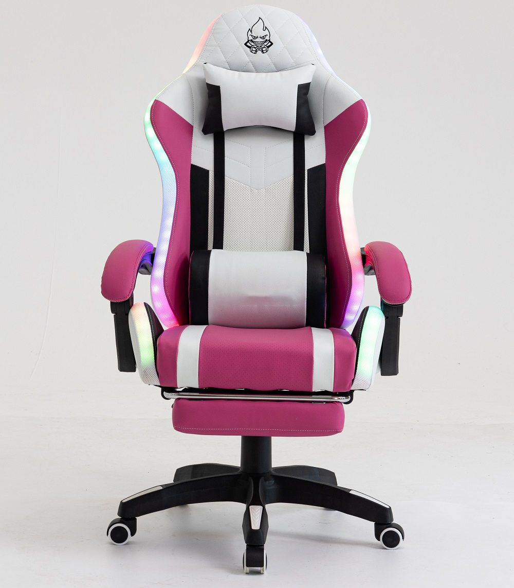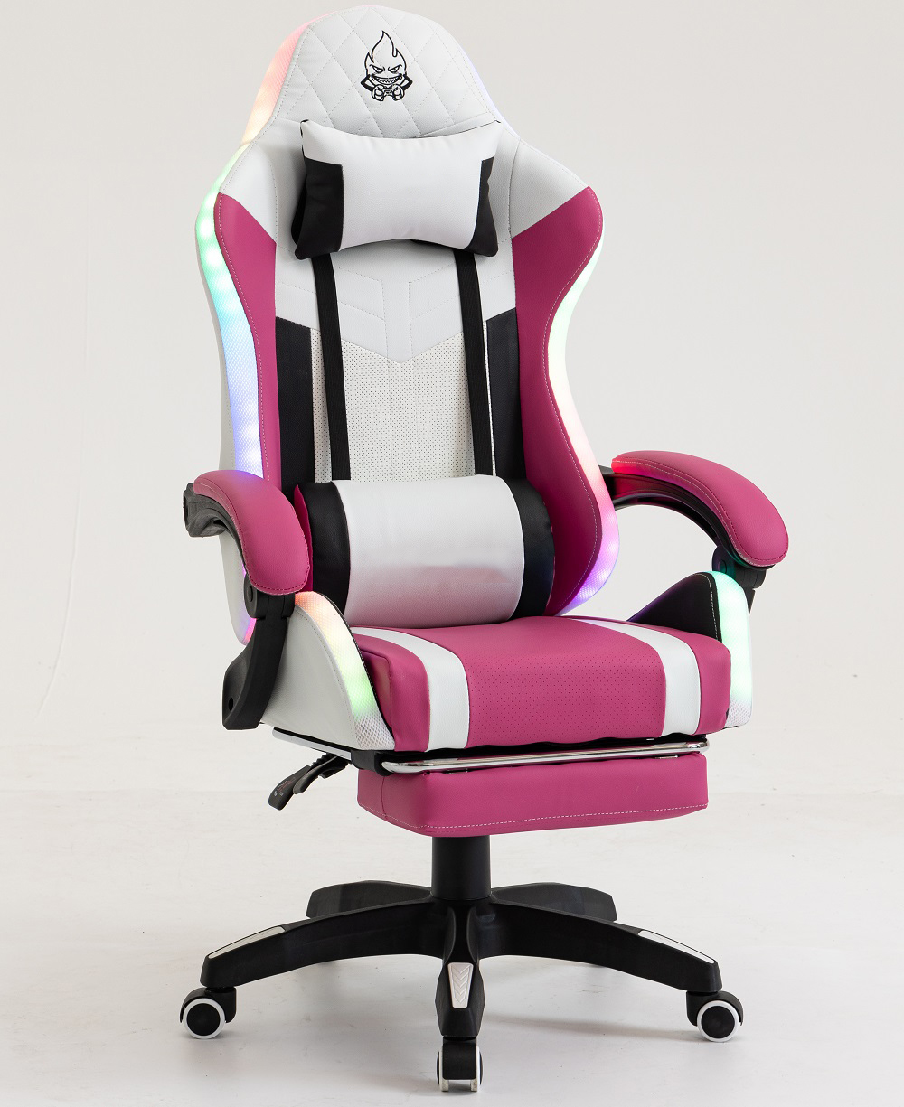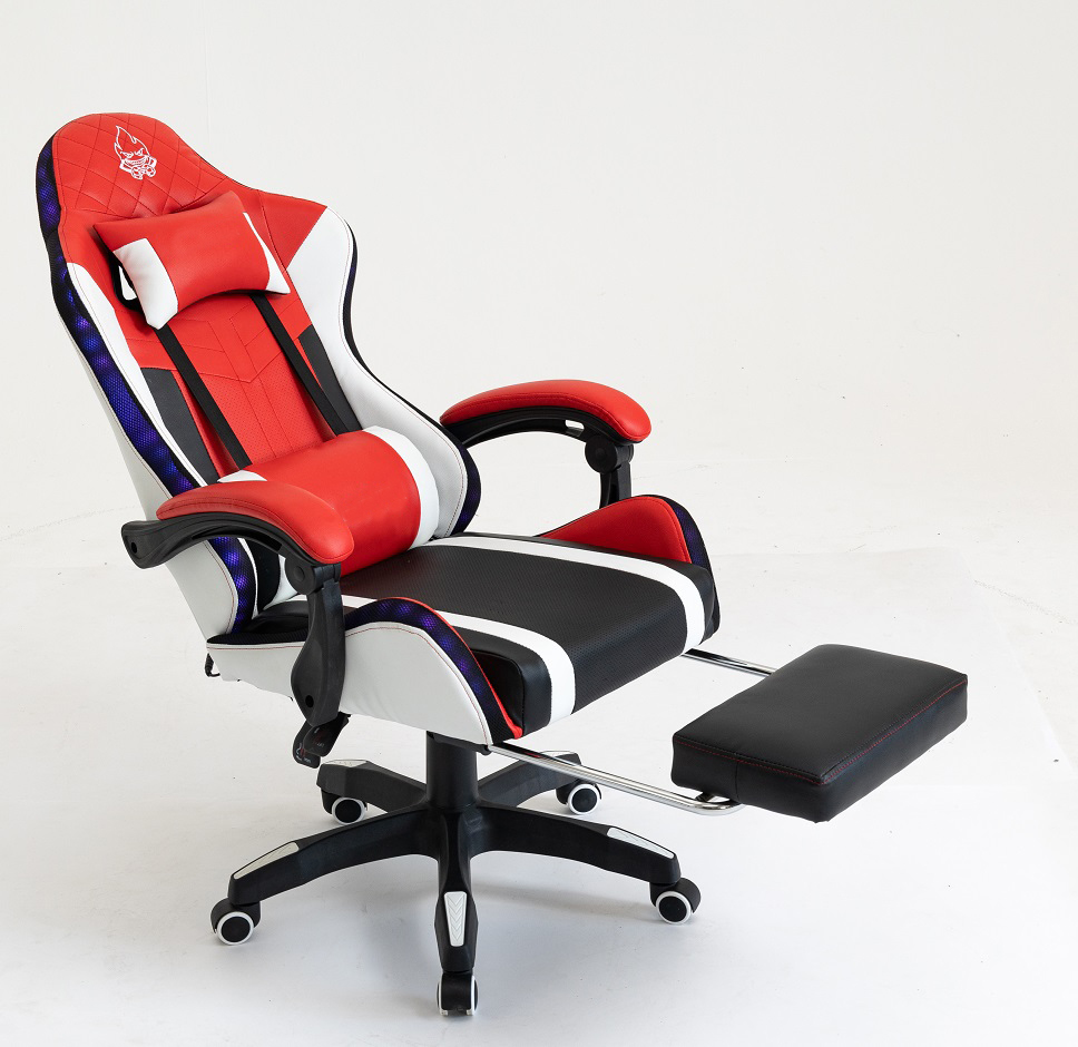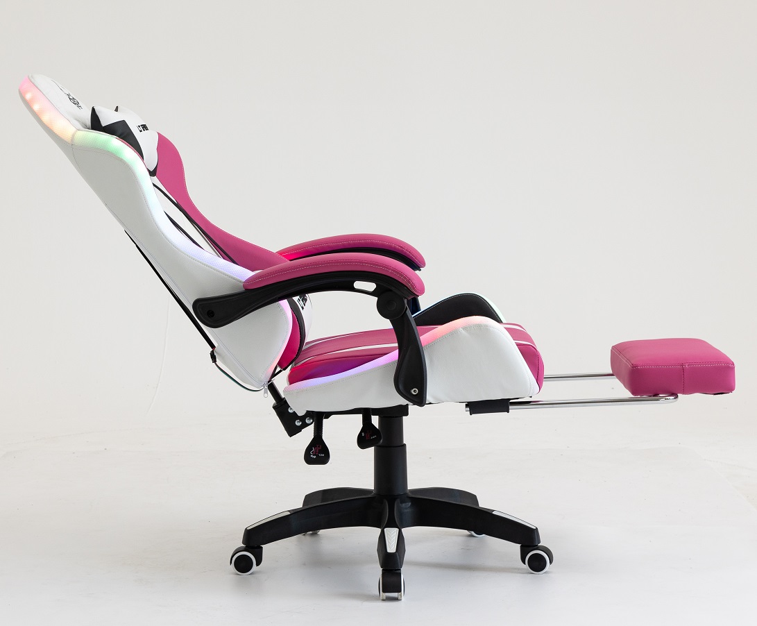 This chair combines a 360° swivel base, height-adjustable gas lift, RGB LED lighting, built-in speakers (usually Bluetooth), a retractable footrest, and a lumbar massage function. It typically also offers reclining backrest, caster wheels, and padded armrests.