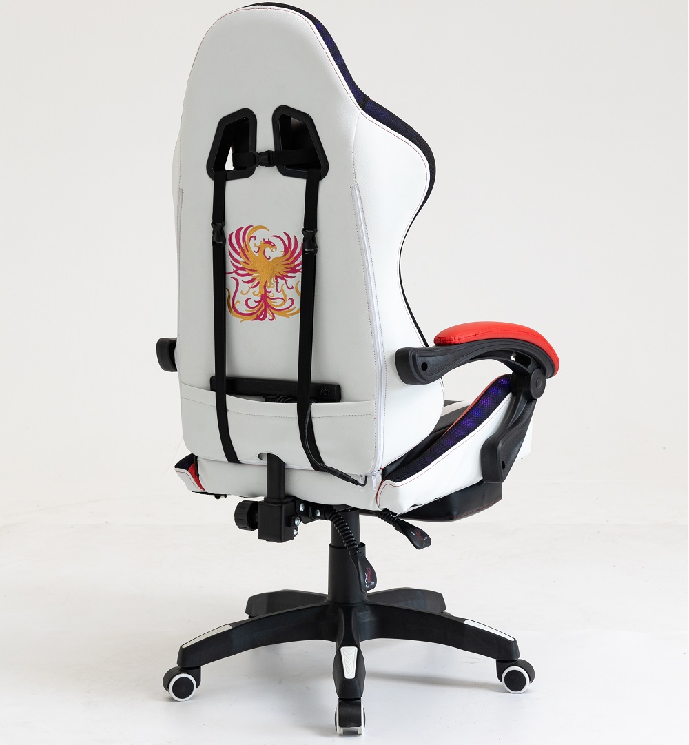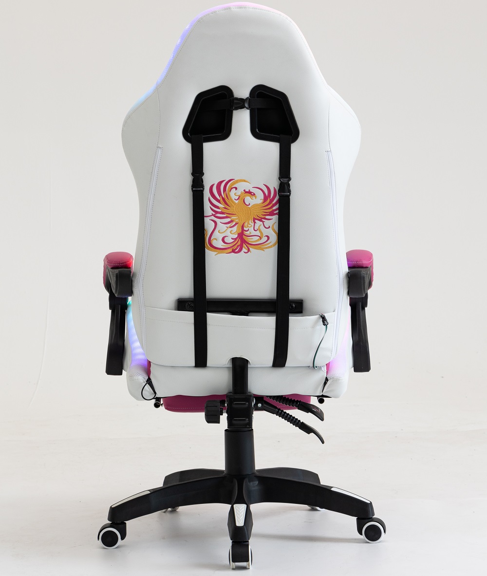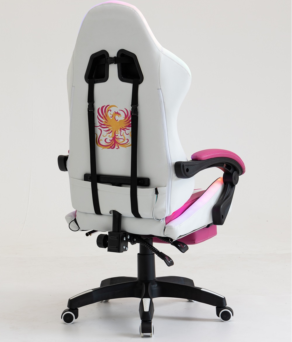 This chair combines a 360° swivel base, height-adjustable gas lift, RGB LED lighting, built-in speakers (usually Bluetooth), a retractable footrest, and a lumbar massage function. It typically also offers reclining backrest, caster wheels, and padded armrests.
