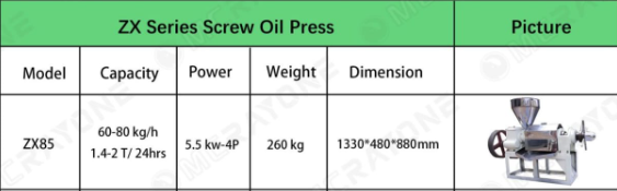 The ZX85 Oil Press Machine can extract oil from a variety of oil crops, including peanuts, soybeans, rapeseed, walnuts, cottonseed, and many others.