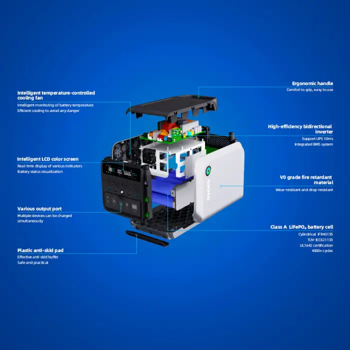 The OM-600 is equipped with a high-capacity LiFePO4 battery, designed for longevity with a cycle life of 4500 cycles at 80% depth of discharge.