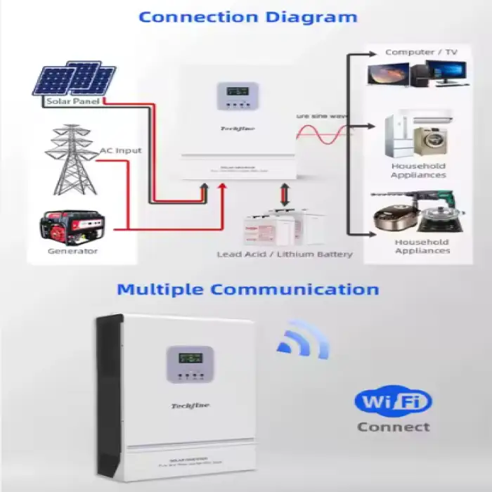 The inverter can be easily integrated into a home solar power system by connecting solar panels, batteries, and AC loads according to the installation guidelines.