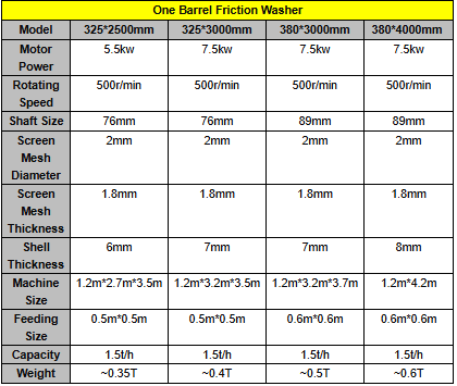 The One Barrel Friction Washer has a capacity of 1.5 tons per hour.