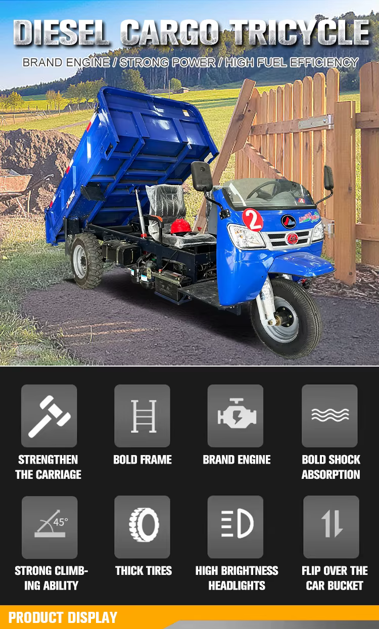 The Open-Body 3-Wheel Cargo Motorcycle is equipped with a powerful diesel engine.